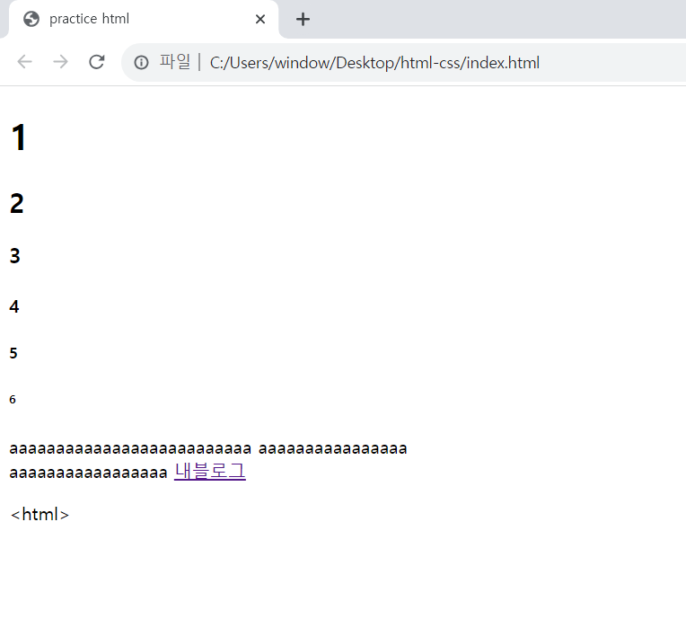 <h1></h1>은 제목을 나타내는 태그로 h1~h6까지 있다. 숫자가 작을 수록 중요한 제목이고 아무런 스타일을 입히지 않으면 h1에서 h6순으로 크기가 작아진다.