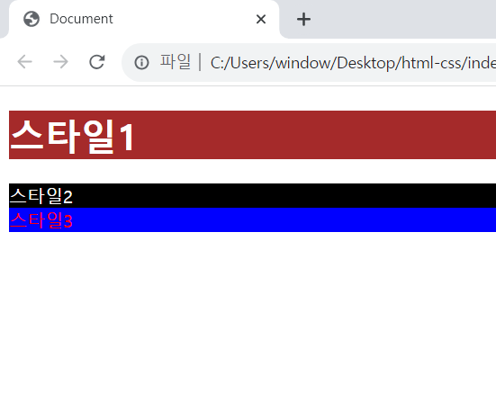 위 코드에서는 body에서 글자색을 빨간색으로 지정했지만 스타일 1과 스타일 2는 자신의 태그가 우선시되는 것을 확인할 수 있다.