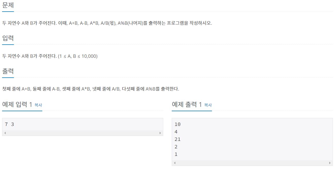 두 자연수 A와 B가 주어진다. 이때, A+B, A-B, A*B, A/B(몫), A%B(나머지)를 출력하는 프로그램을 작성하시오.