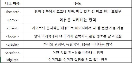 <div>와 기능은 같지만 의미가 담겨있는 태그을 뜻한다.