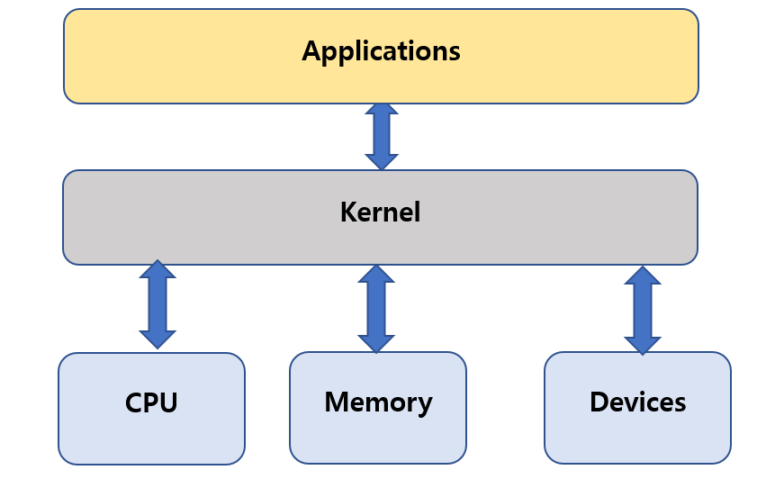 - 역할: 컴퓨터 시스템의 자원을 관리(프로세스 관리, 메모리 관리, 파일 시스템 관리, 입출력 장치 관리), 사용자에게 시스템 자원을 활용할 수 있는 기능을 제공(텍스트 에디터, 시스템 관리 도구, 소프트웨어 개발도구(환경))