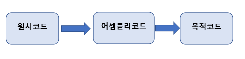 - 어셈블리코드: 프로그래밍 언어에 따라 다른 번역기로 번역, 구문 구조를 해석하고 특정 기계를 대상으로 어셈블리 코드를 생성, 어셈블러에 의해 목적코드와 거의 1:1 번역.