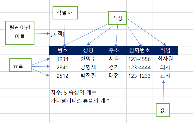 - 구성요소로는 개체(entity)와 그들이 가지는 속성(attribute), 그리고 개체 사이의 관계(relation)가 존재.
